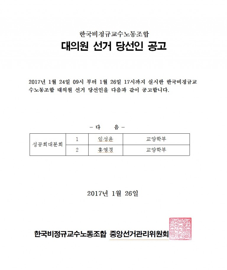 조합 대의원선거 당선인 공고 페이지 정보 작성자 관리자 작성일17-01-26 18:24 조회8,658회 댓글0건 이전글 다음글 목록 본문 조합 대의원선거 당선인 공고 추천 0 댓글목록 등록된 댓글이 없습니다. 이전글 다음글 목록