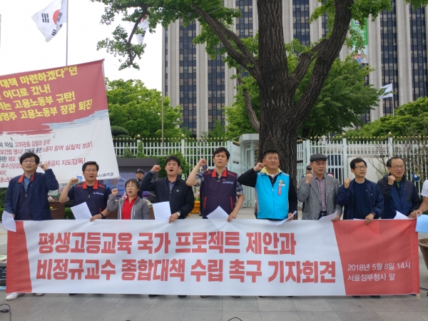 한국비정규교수노조가 시간강사 문제 해결을 위한 새로운 해법을 제안했다. 지난 8일 한국비정규교수노조(위원장 임순광, 이하 한교조)는 정부서울청사 앞에서 기자회견을 열고 ‘평생고등교육 사업’ 추진을 촉구했다. 이 자리에서 임순광 비정규교수노조 위원장은 “요즘처럼 복잡 다양하고 변화무쌍한 시대에는 기존의 평생교육 차원을 넘어서는 의미 있는 교육이 필요하다”며 “인문학뿐 아니라 다양한 학문적 지식을 대학 밖으로 가지고 나와 전 국민이 함께 나눌 수 있도록 하자”고 이번 기자회견의 취지를 밝혔다.
