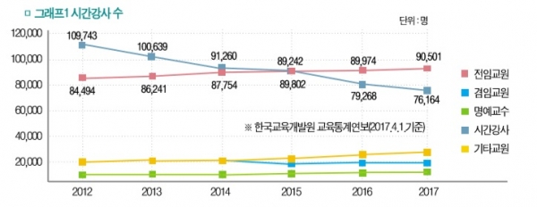 첫째는 강사법이 도입되면 시간강사가 설 자리 줄어든다는 것이다. 그래프1에서 시간강사의 수가 급격히 줄었던 해들을 보면 강사법 도입의 부작용을 예측해볼 수 있다. 시간강사 수는 2012년에서 2013년으로 넘어가면서 9천명, 그 다음해 다시 9천명 그리고 2015년에서 2016년에 만 명이 줄었다. 이 시기들은 공통적으로 강사법 시행가능성이 높았다. 2012년, 2013년, 2015년은 모두 법 제정 혹은 유예로 다음해 1월로 예정된 강사법 시행의 직전 해였다. 시행을 앞두고 시간강사 계약 연장을 하지 않거나 줄이는 것으로 해석할 수 있다. 반면 시간강사를 대신할 수 있는 비정년 트랙 전임교원이나 초빙교수, 명예교수의 수는 늘었다. 임 위원장은 “강사법 도입으로 시간강사에 대한 법적, 경제적 부담이 가중되자 대학들이 겸임교원, 초빙교수, 명예교수를 고용하는 것을 선호했다”고 주장했다.