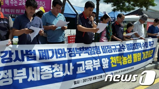 한국비정규교수노동조합(비정교수노조)은 23일 정부세종청사 교육부 앞에서 기자회견을 열고 강사법 폐기와 올바른 법개정 추진을 즉각 선언할 것을 김상곤 부총리 겸 교육부장관에게 요구했다.