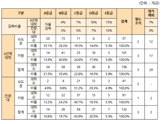국회 교육문화체육관광위원회 정진후 정의당 의원이 교육부로부터 ‘대학구조개혁평가 지역별 등급 분포 및 모집정원’ 자료를 받아 분석한 결과 수도권(서울‧경기‧인천) 대학 57개교 중 35.1%인 20개교가 A등급을 받은 것으로 나타났다. 이에 반해 수도권을 제외한 지역의 101개 4년제 대학이 A등급에 포함된 대학은 14개교에 불과했다. A등급은 정원 조정이 필요 없다는 점에서 지방대 중심의 정원감축은 사실상 불가피하다.