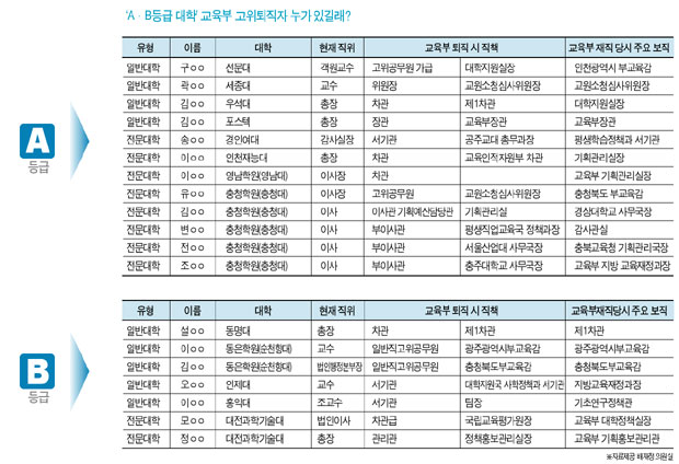 이들 대학은 전직 교육부 장·차관, 예산담당관 등이 총장·이사장·교수 등으로 재취업해 있다. 실제로 구조개혁평가에서 ‘하위 15%’에 지정된 대학이 수년만에 A등급으로 수직상승한 결과에 대해 대학가에선 의혹의 시선을 보내기도 했다.