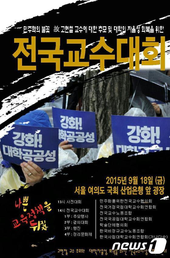17일 전국교수비상대책위원회 및 지역대학교수회에 따르면 이들은 18일 국회의사당 인근에서 전국 국·사립 대학 80여개교 교수들이 모여 '고 고현철 부산대 교수 추모와 대학 자율성 회복을 위한 전국 국공립 및 사립대학 교수대회'를 개최한다.