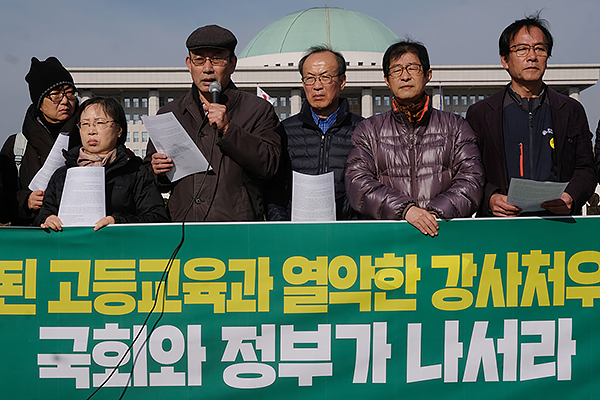 비정규교수노조(위원장 김용섭)는 27일 오전 국회 앞에서 기자회견을 열고 "국회 일부 의원들이 강사 1인당 지원금이 너무 적다는 이유로 예산 전액 삭감을 주장하는 망발을 보이고 있다"며 이같이 비판했다. 올해 8월1일 시행된 고등교육법 개정안은 시간강사에게 교원 지위를 부여하고, 1년 이상 임용과 3년까지 재임용 절차를 보장한다. 방학 중에도 임금을 지급한다.