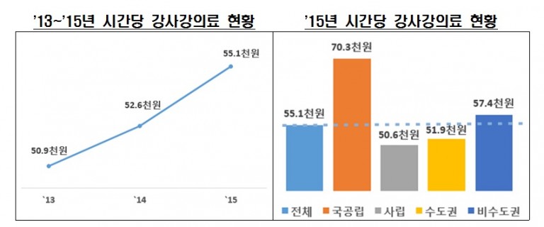 ○ ‘15학년도 1학기 시간강사 시간당 강사강의료는 55.1천원으로